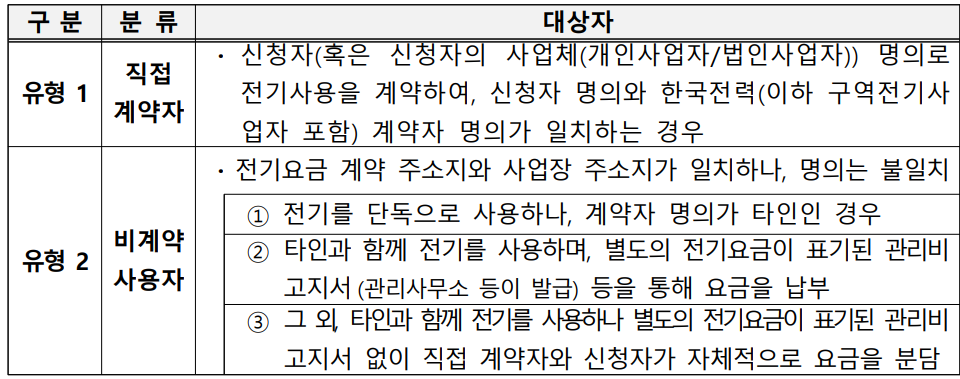 - '22년 12월 이전 개업자는 월 1.2만원 이상 전기요금 납부 증빙서류 1건