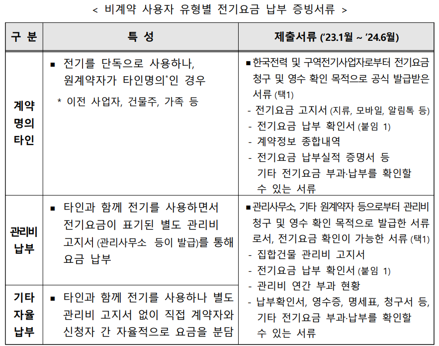 신청자 정보 입력, 유형별 전기요금 납부 증빙서류